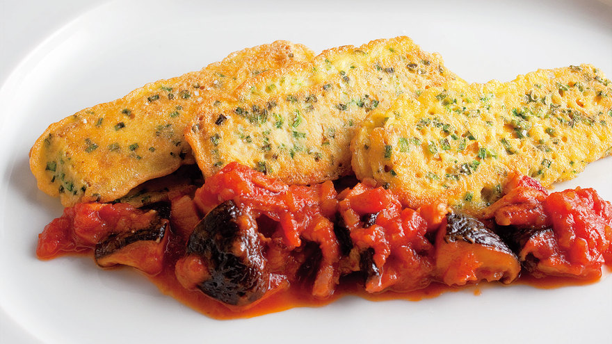あいたフライパンにオリーブ油少々を足して中火で熱し、ベーコンとしいたけを炒める。1の【トマトソース】をカップ1ほど加えてサッと混ぜ、4に添える。