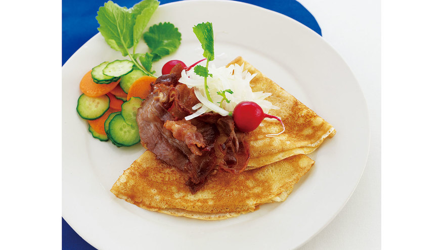 しっとりとした口当たりのクレープに、カリッと焼けた豚肉がよく合います。はちみつを混ぜた甘めのみそがポイント。