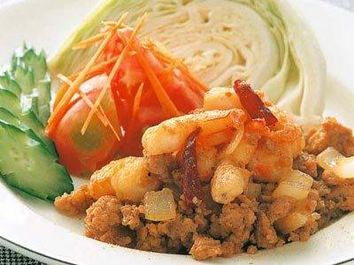 鶏ひき肉のストックをナムプラーと砂糖で甘辛く。野菜とからめながら食べるサラダです。