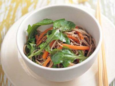 あいた5のボウルにそばとにんじん、【B】を加えて混ぜる。ルッコラを戻し入れて、サッと混ぜたら器に盛りつける。七味とうがらしや粉ざんしょうをふる。