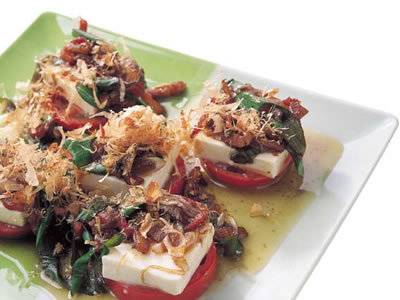 器にトマト、豆腐、バジルの順に重ね、削り節を上からのせて3のソースを熱いうちに回しかける。