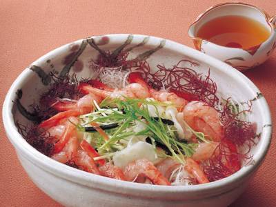 昆布のうまみと香りをつけた甘エビをたっぷりの野菜や海藻といっしょに、からし酢でいただきましょう。