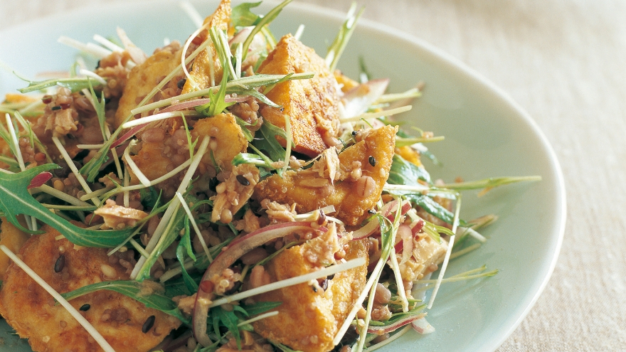 カリッと焼いた厚揚げを使った、豊かな食感のサラダ。油揚げの新定番料理です。