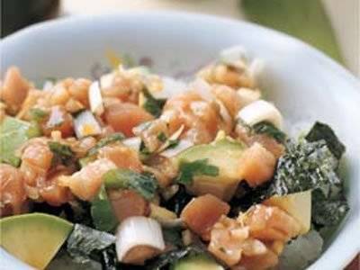 アボカドでコクをプラスした、レアステーキ風に焼いたまぐろ。パセリたっぷりのご飯にあいます。