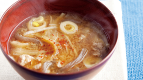 れんこんはたたいて味をしみ込みやすくし、ダイナミックな食感を楽しみます。みそは2回に分けて加えるのがポイント。1回目はスープの下味に、2回目で風味をプラス。