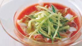 「ガスパチョ」はたくさんの野菜でつくるスペインの冷製スープです。 トマト缶にヨーグルトを加えると少ない材料でも味が広がります。
