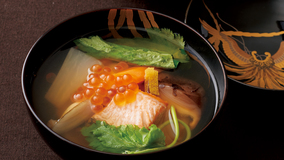 お正月や祝いの席でいただくことの多い椀物・雑煮。ベースとなる汁の味は、出汁をしっかりとったすまし汁や白みそ仕立て、醤油など全国各地でさまざま。具材も焼いた餅を入れる関東風や、里芋や大根などの根菜を入れた関西風など、地方によって特色があります。どれも、郷土色豊かで美味しいものばかり。豊かな日本の食文化を感じさせる、雑煮のレシピをプロの味付けで紹介します。美しい盛り付け雑煮は、おもてなしにもぴったりの料理です。