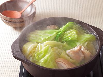 鶏のうまみがしみ込んだキャベツの味は、まさに最高。具材はシンプルにキャベツと鶏肉のみ。残っただしで雑炊をつくってもおいしくいただけます。
