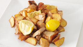 チキンソテーを野菜といっしょにさらに軽くソテー。香ばしく揚げたじゃがいもは、レモンを搾ってさっぱり味に仕上げます。