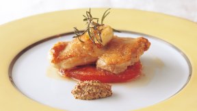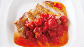 鶏肉を焼いた油で生のトマトを炒めた簡単トマトソースを、カリッと焼いたチキンにたっぷりとかけます。