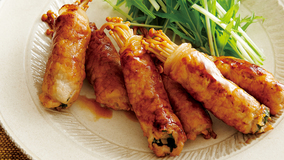 たっぷりのえのきだけを豚肉で巻き、甘辛味の照り焼きに。束ねたえのきだけのシコシコとした食感が新鮮です。