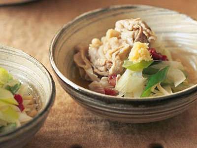 にんにくと梅干しの風味をきかせただけのあっさりとした「ちり鍋」に、柚子こしょうのたれを添えて。
