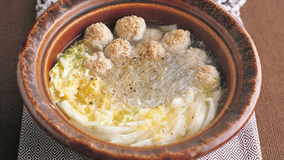 【達人たちの鍋レシピ】~力士絶賛ちゃんこ鍋~ 丁寧にとられただしに具のうまみが溶け出してとても上品な味。宮城野部屋特製のふっくらとしてコクのある鶏だんごが、おいしさの要です。