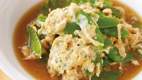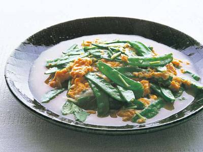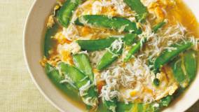 たっぷりの絹さやを色よく煮て、歯ごたえを残して、卵でふんわりまとめます。絹さやの甘みとしらす干しの塩けが絶妙の相性です。