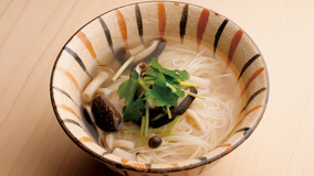 つゆに用いる吸い地の一部で焼きなすを煮含めます。よく味を含んだ具とめんとの取り合わせをお楽しみください。