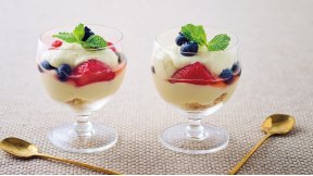 マンゴージャムを混ぜ込んだチーズ生地は、風味も色もトロピカル!ゼラチンを少なめにして、なめらかな舌ざわりに仕上げます。季節に合わせ、好みのジャムでつくってみてください。