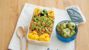 野菜がたっぷりで、彩りのきれいな理想的なお弁当。市販の調味料を使って手早くつくります。調理器具を使い分けて、効率よく。