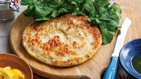 イーストを使わない手軽なパン。生地にねぎとベーコンを巻き込み、フライパンでカリッと焼き上げます。アツアツを切り分けてルッコラやオリーブ油と合わせれば、前菜にも。