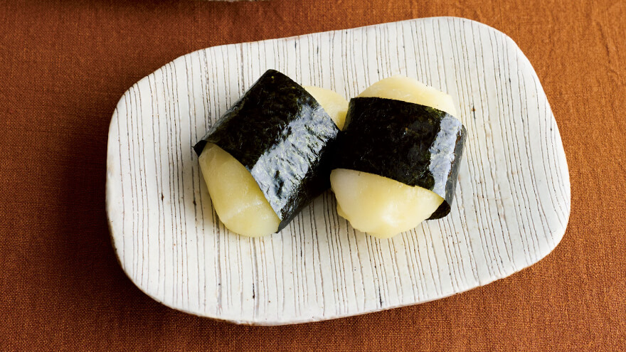 触れるくらいに冷めたら、手で半分にちぎる。さらに半分にちぎりながら丸く形を整える。のりをキッチンばさみで2~3cm幅に切って巻きつける。