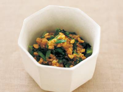魚介、トマトのうまみに干しえびも加わった、味わい豊かなスープです。クレソンはフレッシュ感を残し、「ごま砂糖塩」をつけておひたし感覚で。
