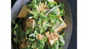 豆腐と野菜を昆布としいたけのだしで煮て、韓国風の2種類のたれで楽しむ湯豆腐です。柚子風味のポン酢には辛みをプラス。ごま油塩だれはシンプルな分、豆腐の風味がよく引き立ちます。