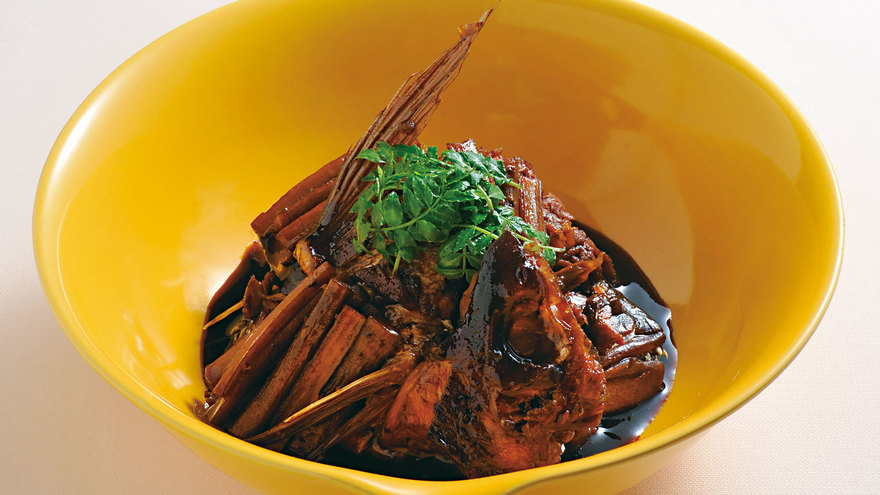 煮上がり。照りつやよく仕上がればよい。器にアラ、ごぼうを盛り、木の芽をのせる。