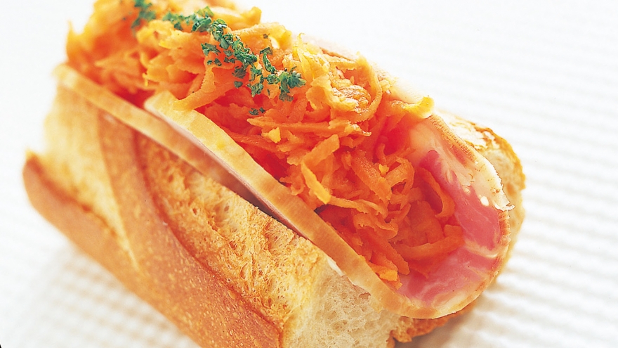 バゲットは長さを2等分にして、それぞれ縦に切り目を入れる。バターを柔らかく練って断面にぬり、ハムを2枚ずつはさみ、【キャロットラペ】を等分にのせる。好みでパセリをのせる。