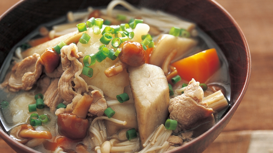 小麦粉でつくっただんごが入った、すいとんのような汁物です。東北地方の郷土料理を食べごたえのある一品に仕上げました。