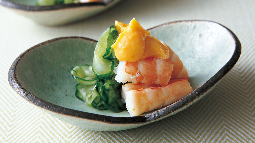 器に2のきゅうりと4のえびを盛り、1の黄身酢適量をかける。