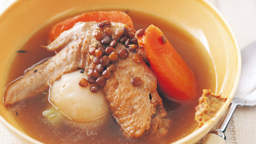 ボリュームのある手羽先とゴロゴロ野菜を水だけで煮るポトフは、しみ出た具材の味わいが滋味深いごちそう。