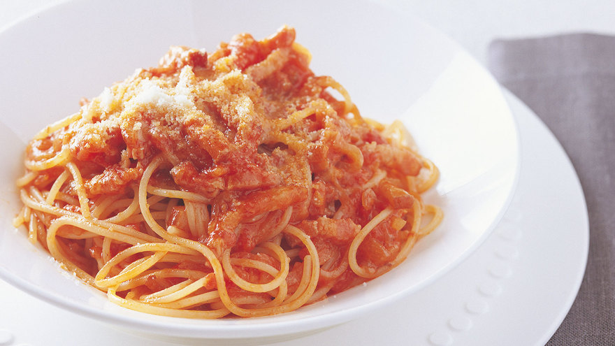 イタリアのアマトリーチェという町の名前からついたパスタ。ベーコンにトマトを加えて煮詰めます。