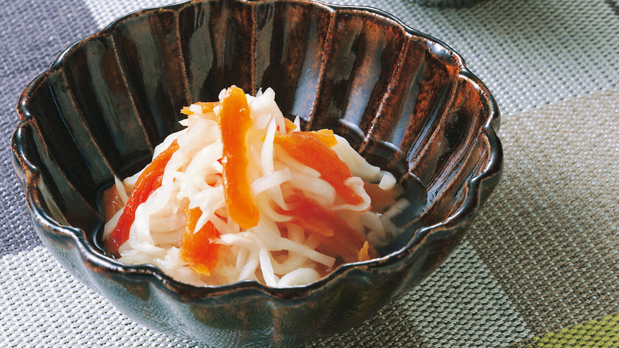 かぶの皮だけでつくってもOK。かぶはあんずとそろえて細切りにすると繊細な口当たりにります。