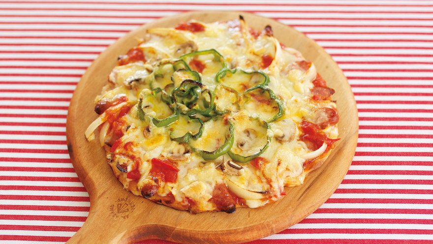 取り出して粗熱が取れたら、2を塗り、たまねぎ、ピーマン、ソーセージ、マッシュルームをのせて、ピザ用チーズを散らす。220℃のオーブンで10分間ほど、生地がカリッとするまで焼く。