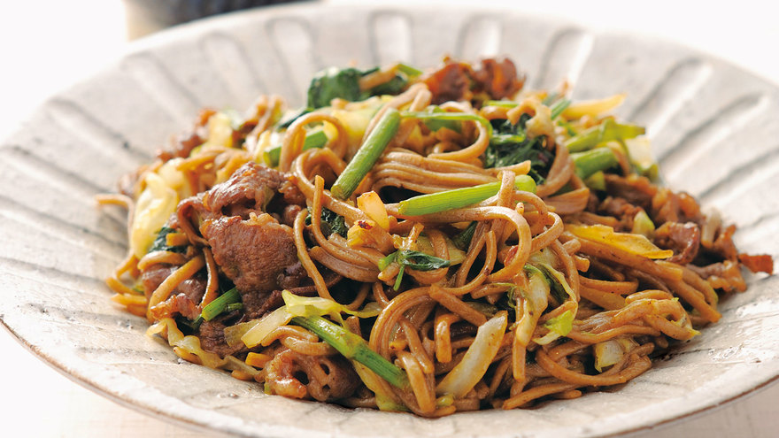 フライパンにサラダ油大さじ2を中火で熱し、牛肉を炒める。キャベツ、せりの茎を加えて炒め合わせ、具材の真ん中をあけるようにしてフライパンの側面に寄せ、そばを加える。
