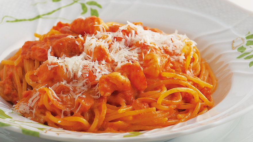 お店で人気のトマトクリームパスタをおうちで簡単に。えびとベーコンのうまみが加わった、濃厚ソースをからませます。
