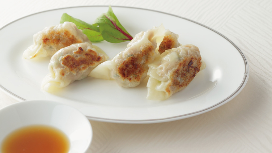 湯がなくなり、パチパチと音がしてきたらふたを取り、完全に水分をとばす。サラダ油小さじ1を鍋肌から加えて強火にし、フライパンを揺すりながらなじませ、底面がカリッとするまで焼く。残りも同様に焼いて器に盛り、葉野菜とたれを添える。