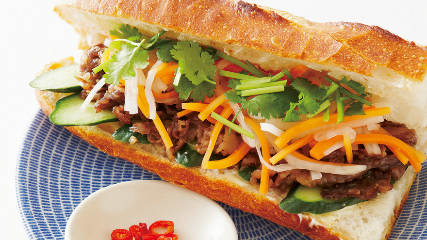 バゲットの内側の両面にマヨネーズを塗り、1のきゅうり、2の牛肉、なます、香菜を順に重ねてはさむ。赤とうがらしを添え、好みで具材の上に散らして食べる。
