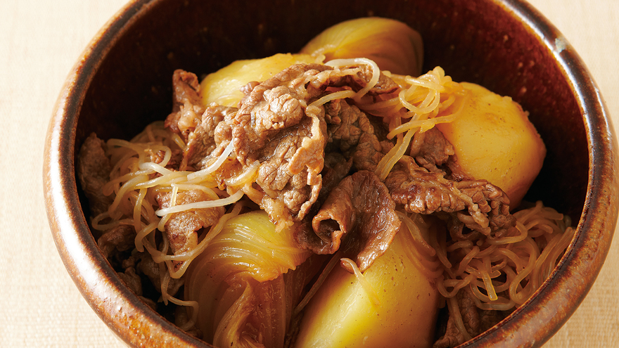 ホクホクのじゃがいもに牛肉のうまみがしみ込むごちそう煮物。調味料は甘みを先に入れると、なじみやすくなります。