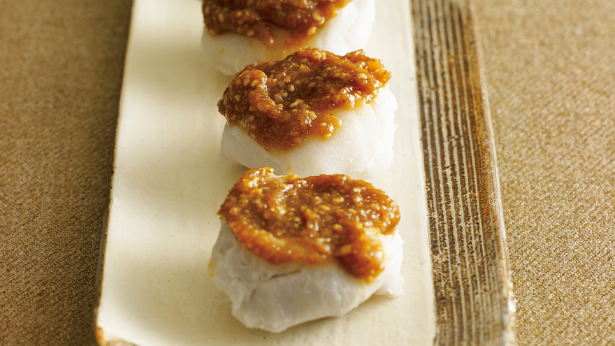 里芋を柔らかくゆで手でつぶし、混ぜるだけ。簡単ごまみそをのせたら、見た目にもかわいい田楽風です。