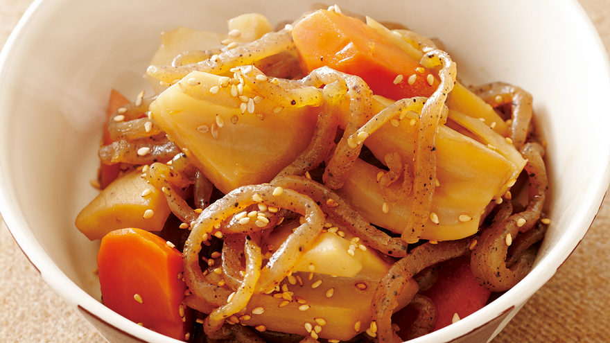 れんこんは縦4等分に切って端を斜めに切り、手前に約90度回して食べやすい大きさの斜め切りにする(乱切り)。水で洗い、水けを拭く。にんじんは一口大の乱切りにする。つきこんにゃくは塩をふってもみ、水で洗って水けをきる。鍋に入れ、浸るくらいに水を加えて中火にかけ、煮立ったら弱火で約5分間ゆでる。ざるに上げて冷ます。