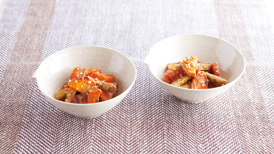 にんじんとごぼうに薄い焼き色がついたら弱火にし、菜ばしでペーパータオルを持って、油をふき取る。中火にして1の【合わせ調味料】を加え、手早くからめる。器に盛り、ごまをふる。