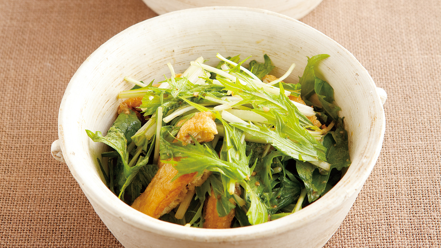 シャッキリ水菜、香ばしく焼いた油揚げが絶妙のハーモニーです。ごまの香りで風味豊かに仕上げました。
