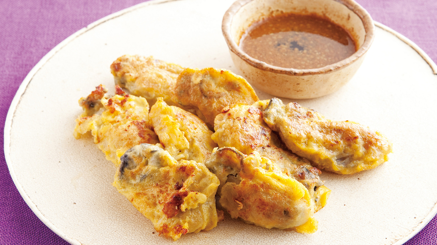 フライパンにごま油を中火で熱し、かきを溶き卵にくぐらせてから入れ、2~3 分間焼く。裏返してさらに2~3分間焼き、両面に焼き色がついたら器に盛る。1の【たれ】を別の器に入れて添える。