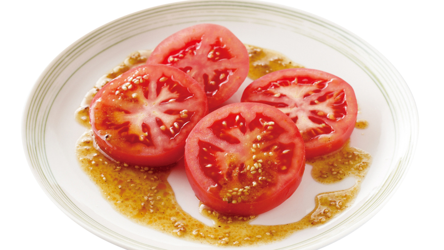 器にトマトを盛る。ボウルに【ドレッシング】の材料を入れ、よく混ぜ合わせてかける。