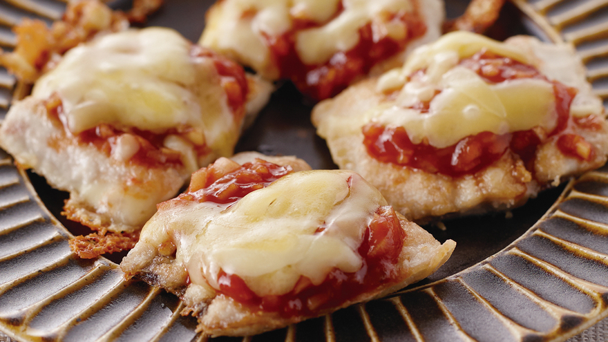 いったん火を止め、ペーパータオルで汚れや脂を軽くふく。【簡単ピザソース】をスプーンでぬり、ピザ用チーズをのせる。ふたをして再び中火にかけ、チーズが溶けるまで蒸し焼きにする。