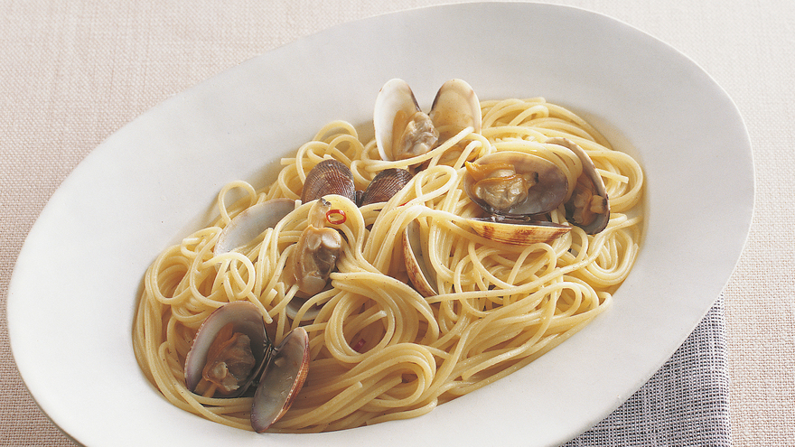 大きめのフライパンにオリーブ油を中火で熱し、にんにく、赤とうがらしを入れて炒め、香りがたったら、あさりを加えて炒め合わせる。全体に油が回ったら白ワインをふり、弱火にしてふたをし、2~3分間酒蒸しにする。あさりの口が開いたらふたを取り、【調味料】の材料を加えて混ぜ、火を止める。