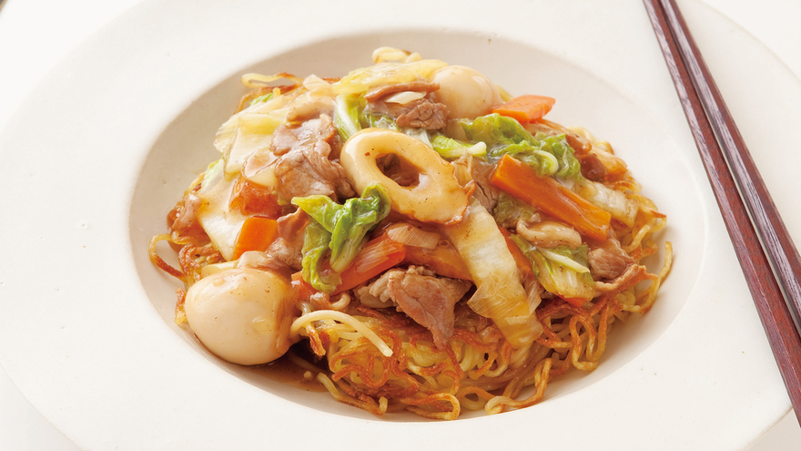たっぷりの具を、トロリ、アツアツのあんでおいしく。めんは、両面カリッと焼いて、あんとのコントラストを楽しみましょう。