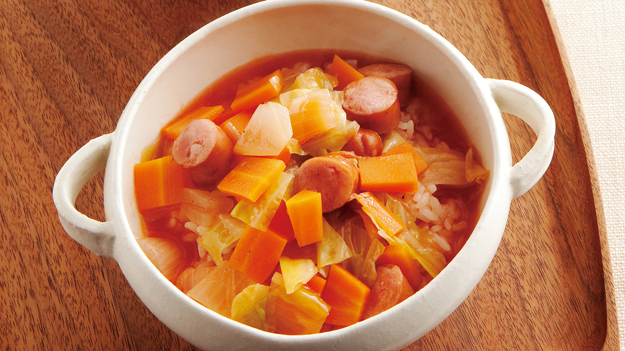 たまねぎは1.5cm四方に切る。にんじんは皮をむき、1cm角の棒状に切ってから、横に2~3mm幅に切る。キャベツは1.5cm四方に切る。ソーセージは横に1cm幅に切る。