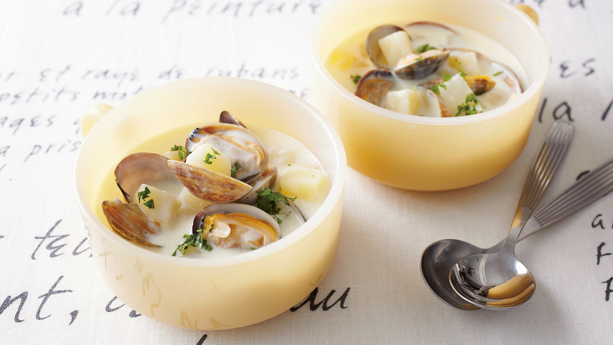 牛乳で煮て、あさりをクリーミーに味わう定番スープです。牛乳は煮立たせないように火加減を調節して風味を生かして仕上げます。