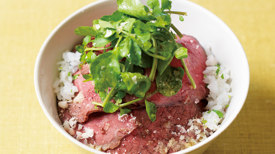 クレソンを混ぜたバターライスに、薄切りのローストビーフをたっぷりのせていただきます。肉のうまみと、ほろ苦い香りが口いっぱい広がります。